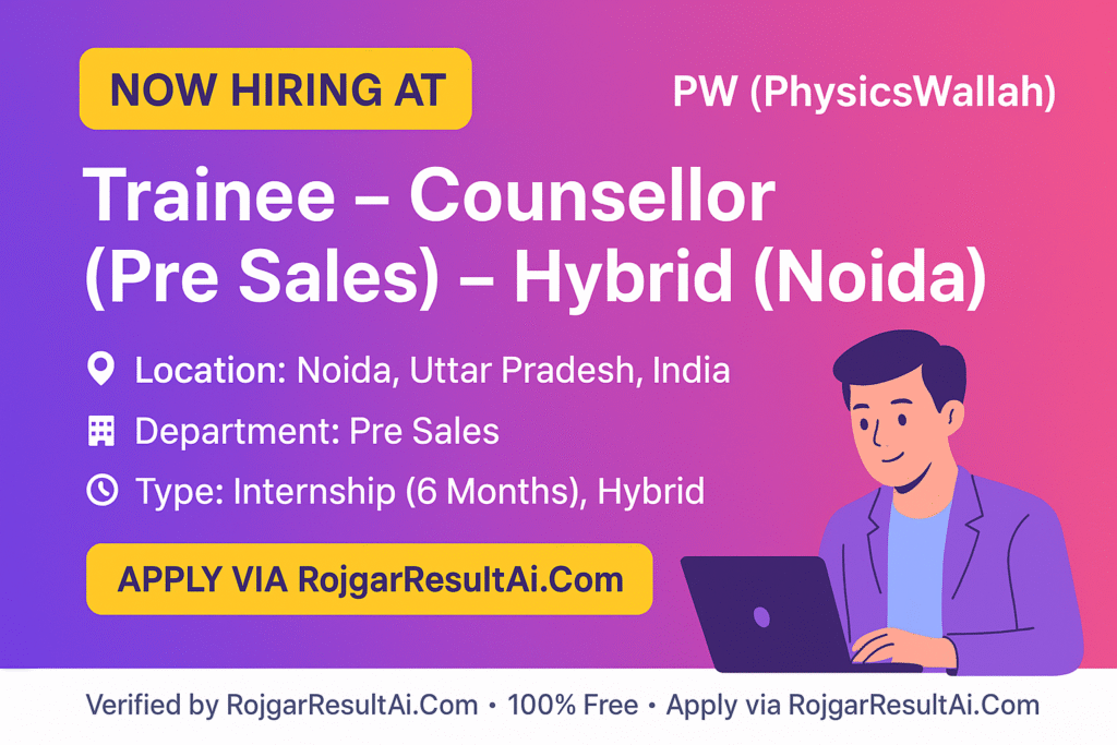 PW (PhysicsWallah) is hiring Trainee – Counsellor (Pre Sales) for its Noida office with a hybrid work setup. This guide covers the Snapshot, company overview, role details, responsibilities, eligibility criteria, salary, selection process, FAQs, and a step-by-step How to Apply. Use this to apply confidently for PW Careers 2025.