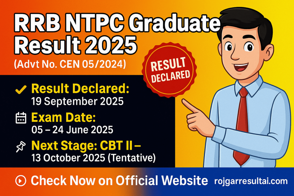 The Railway Recruitment Board (RRB) has officially declared the RRB NTPC Graduate Result 2025 (Advt No. CEN 05/2024) on 19 September 2025. Candidates who appeared in the exam held from 05 – 24 June 2025 can now check and download their result online using their Registration Number and Date of Birth. Below you will find the direct result link, cut-off, vacancy details, and next stage information.